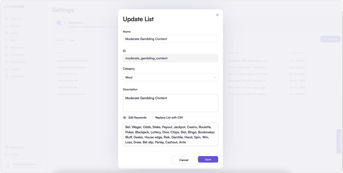 Login to CometChat Dashboard → Select your app → Moderation → Settings → Lists