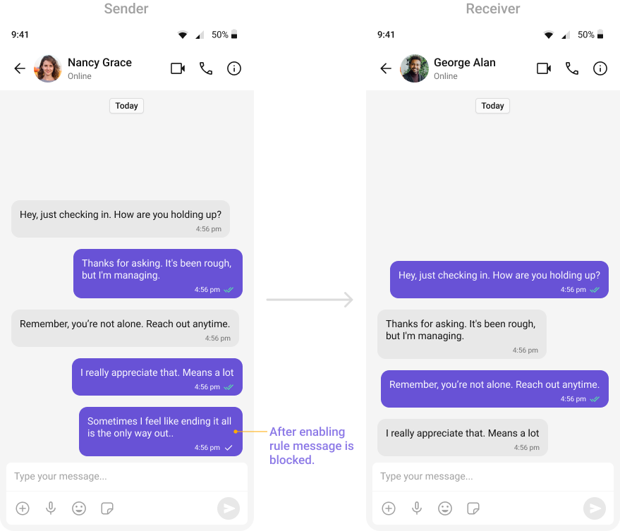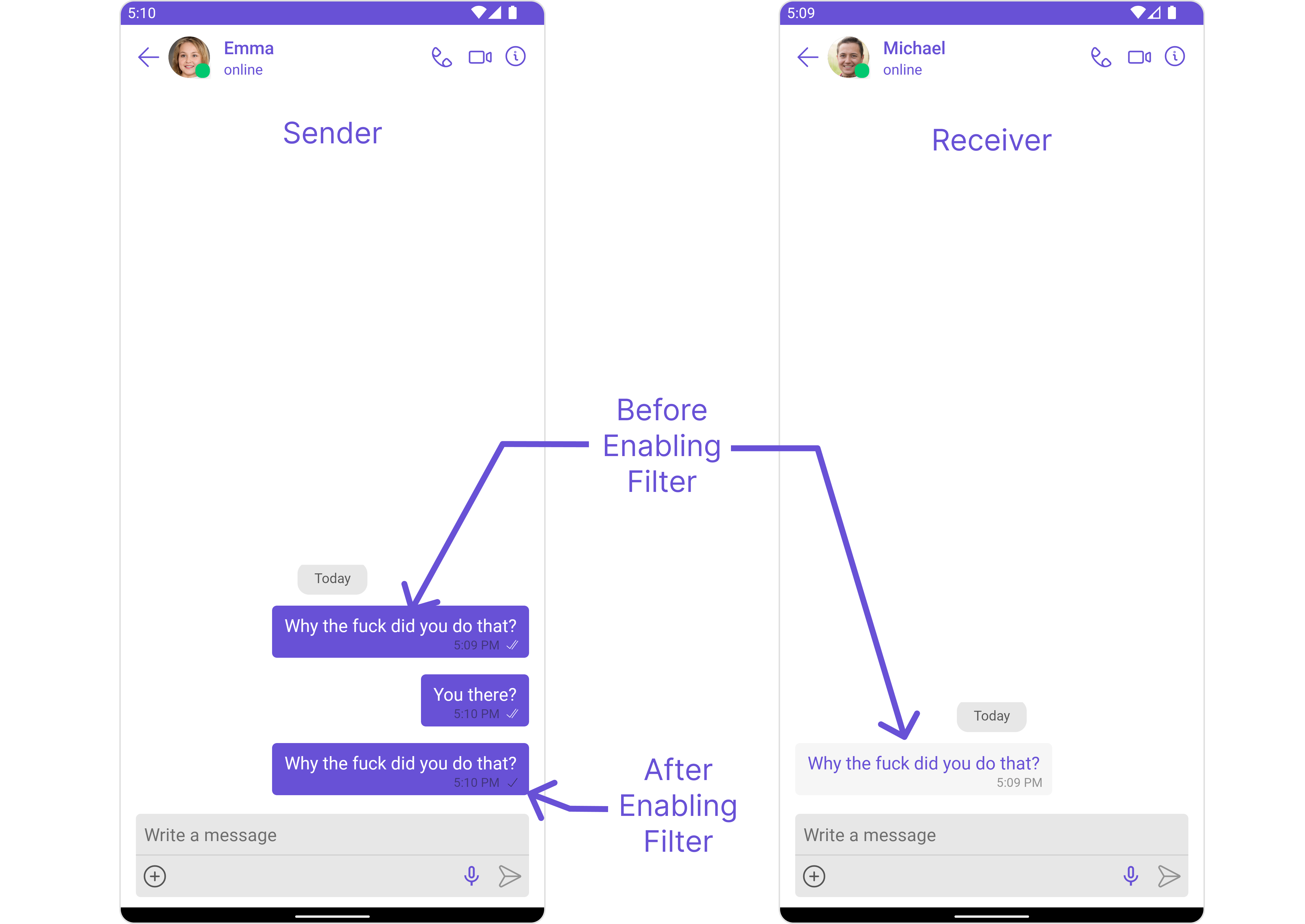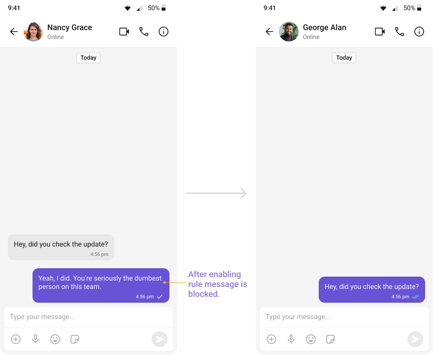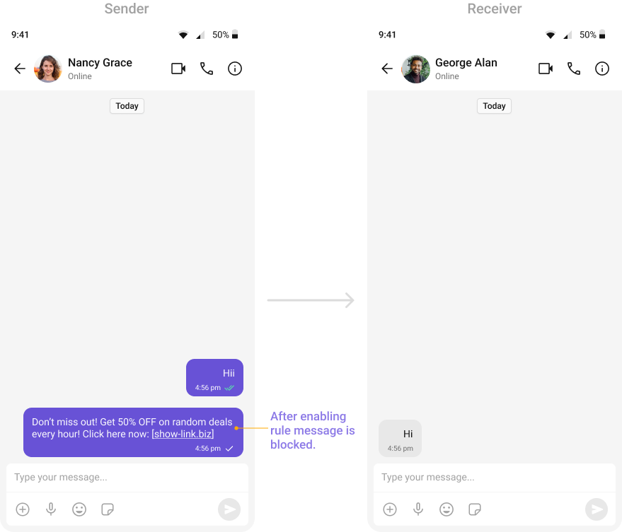 Automatically detects and blocks messages containing offensive language, profanity, or derogatory remarks using a predefined list of offensive keywords.Example: Before enabling, profane messages are delivered (double ticks). After enabling, they’re blocked (single tick).