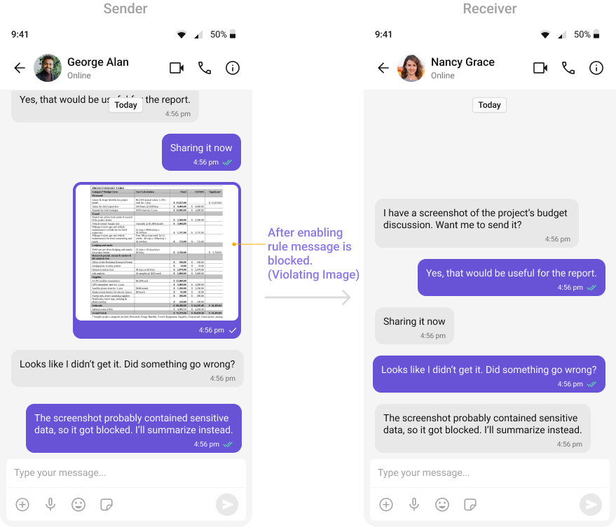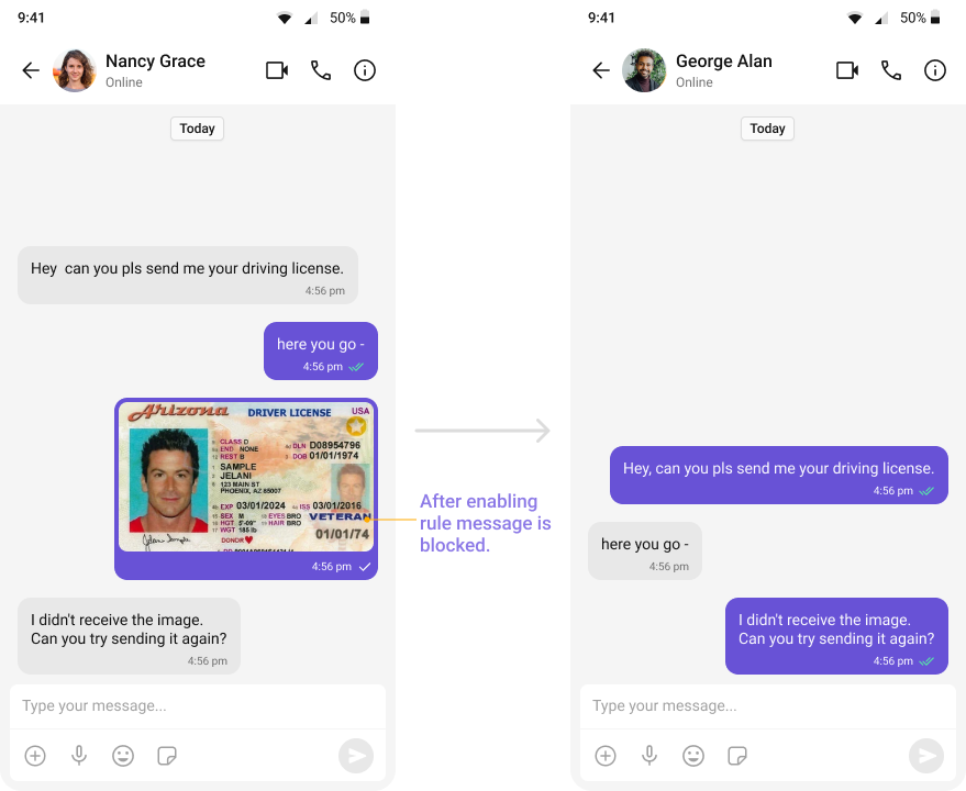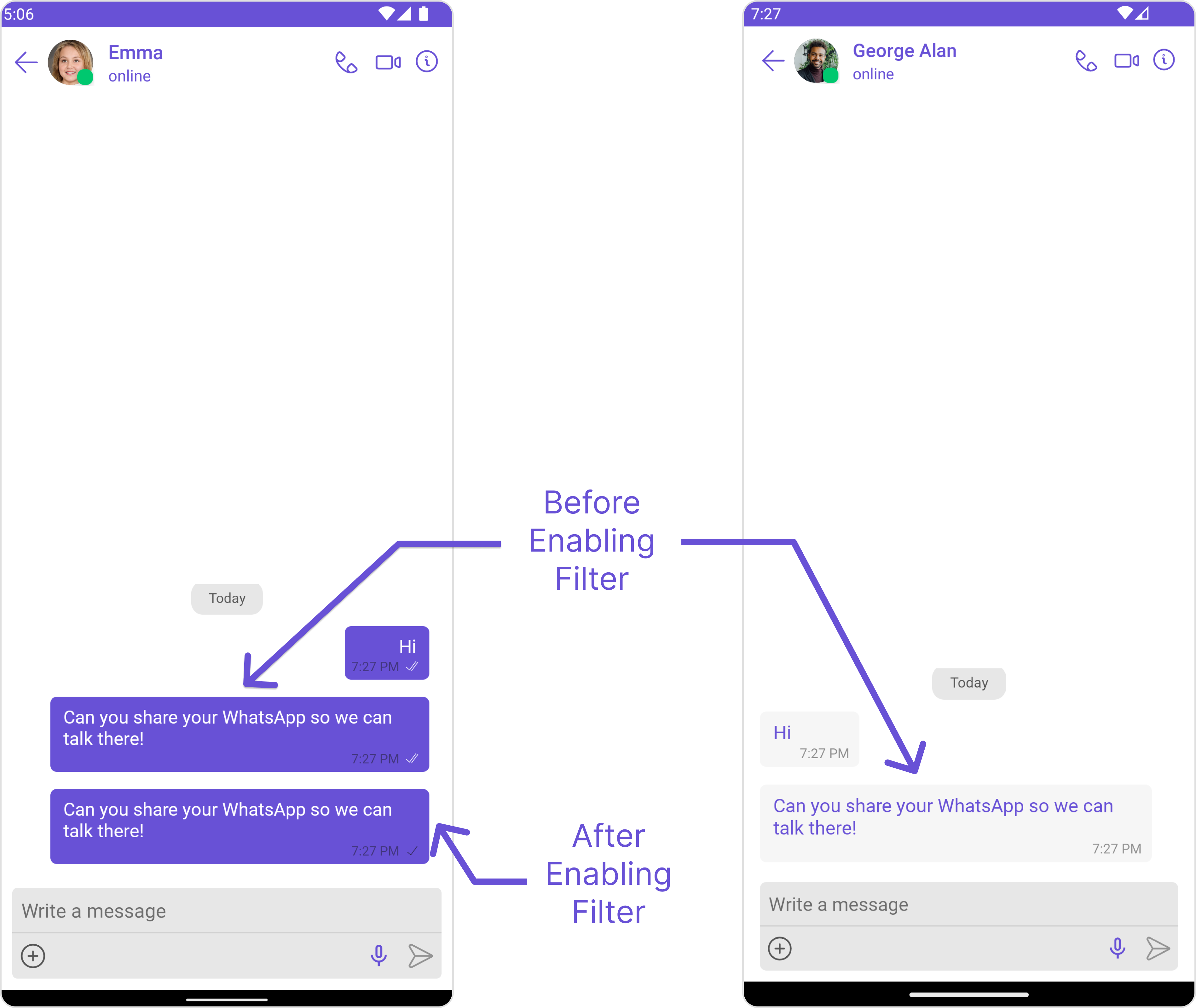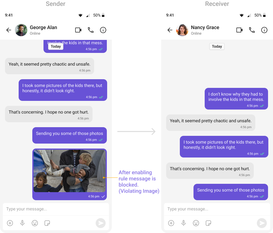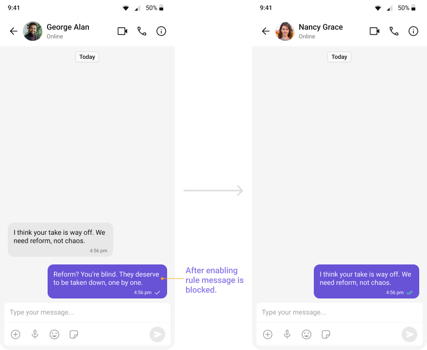 Automatically detects and blocks messages containing offensive language, profanity, or derogatory remarks using a predefined list of offensive keywords.Example: Before enabling, profane messages are delivered (double ticks). After enabling, they’re blocked (single tick).