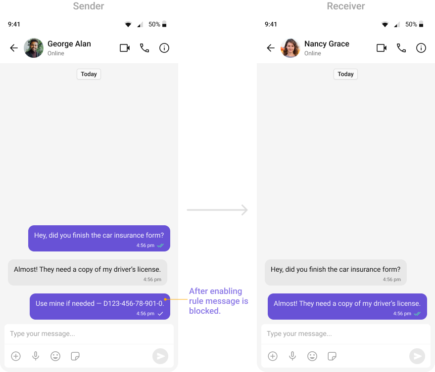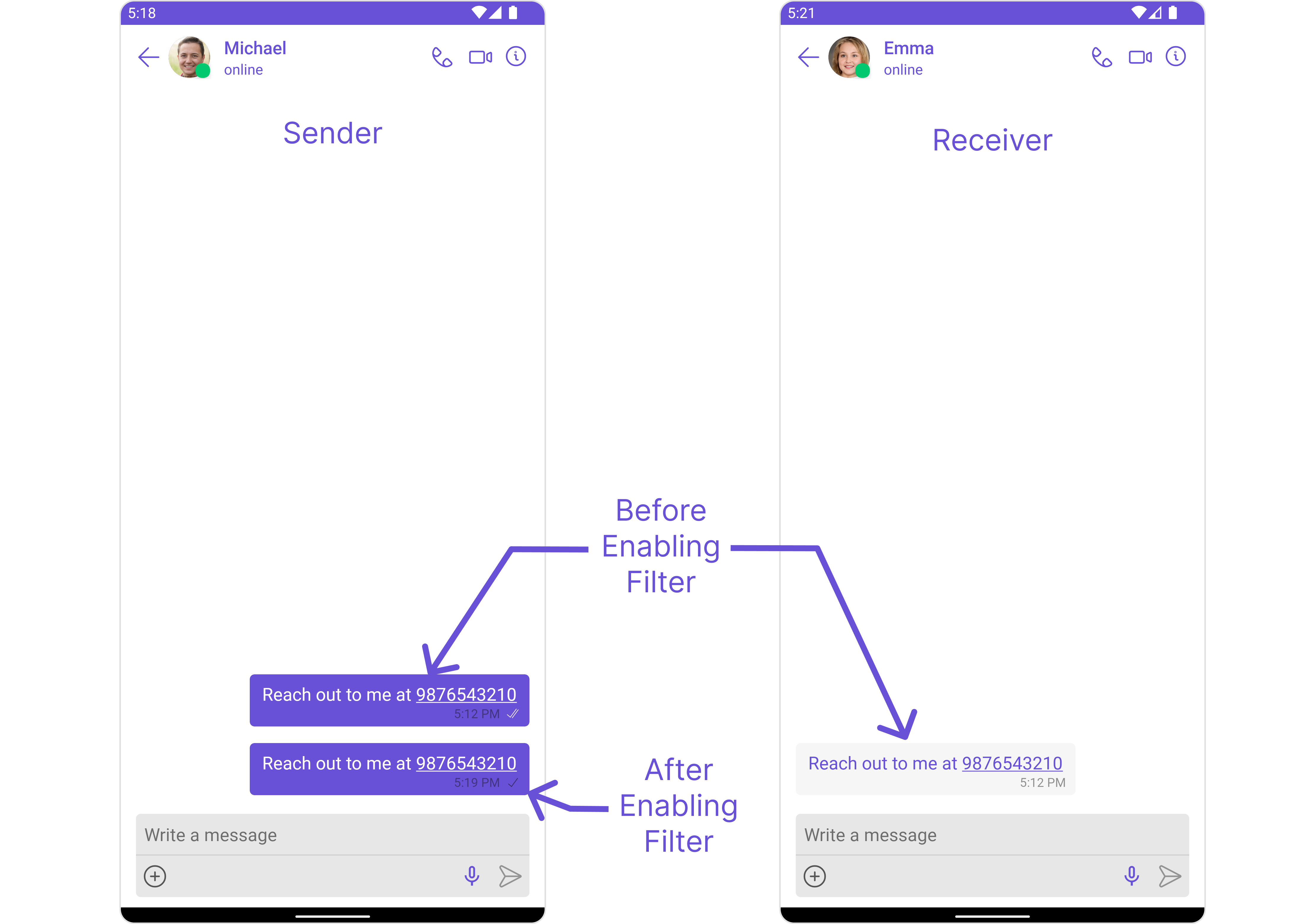 Detects and blocks messages containing phone numbers to prevent sharing of private contact information.