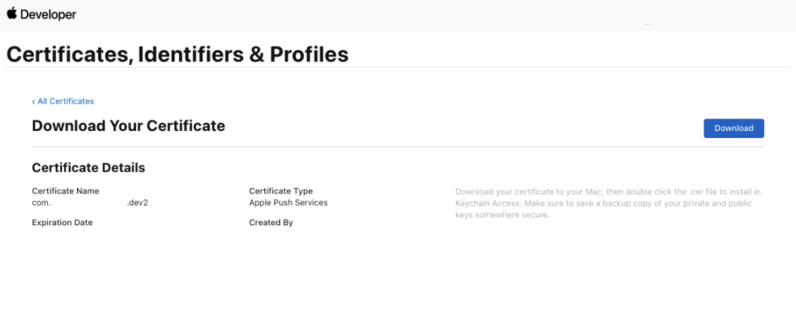 - Select your App ID, upload the CSR, continue, and download the generated
