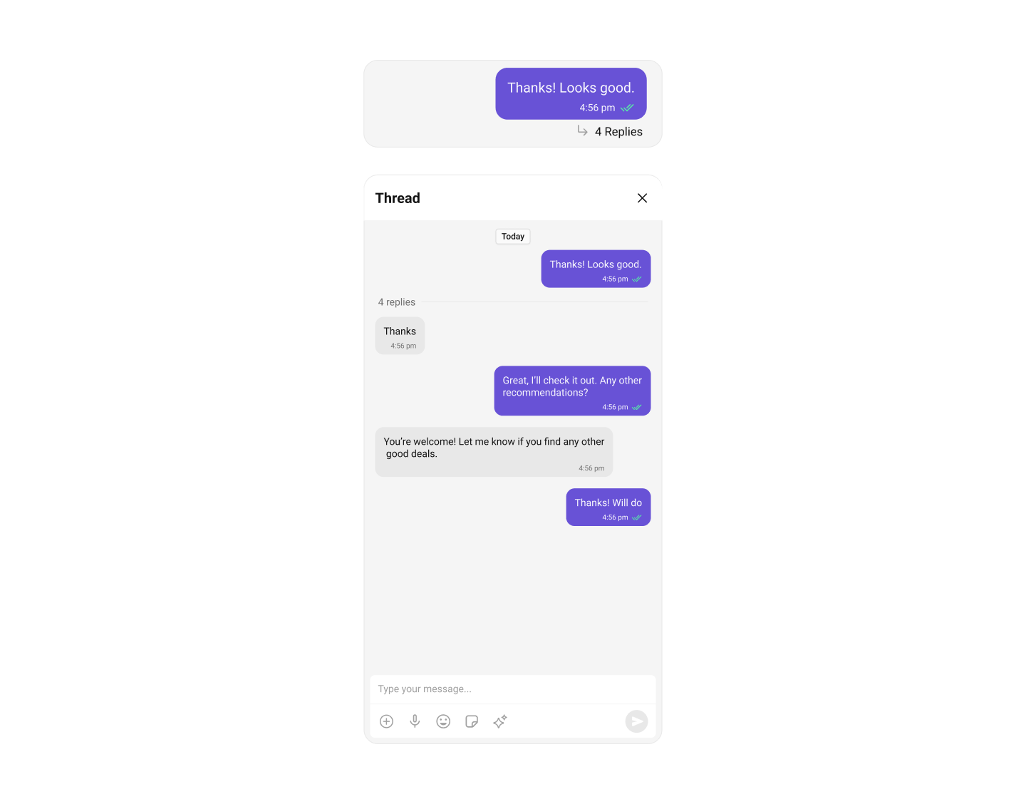 Message ComposerMessage Composer works seamlessly with Quoted Message by showing the quoted reply above the input field, letting users compose their response in proper context.