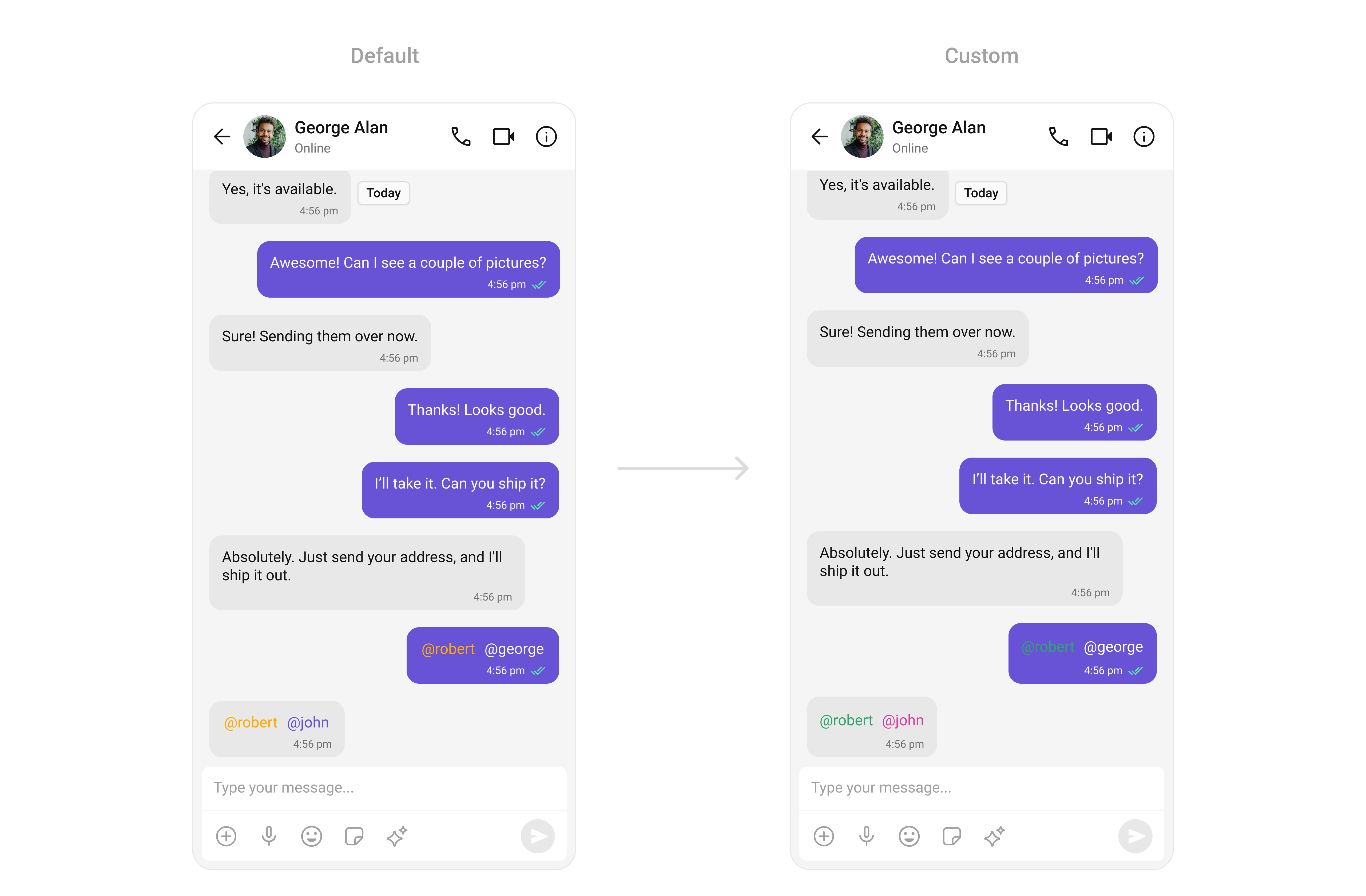 The CometChatMentions Component highlights referenced users or groups within messages. With customizable styles for text color and background, you can ensure mentions stand out clearly in chats while maintaining a cohesive visual theme.