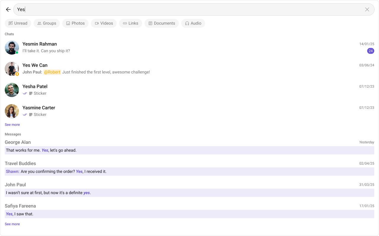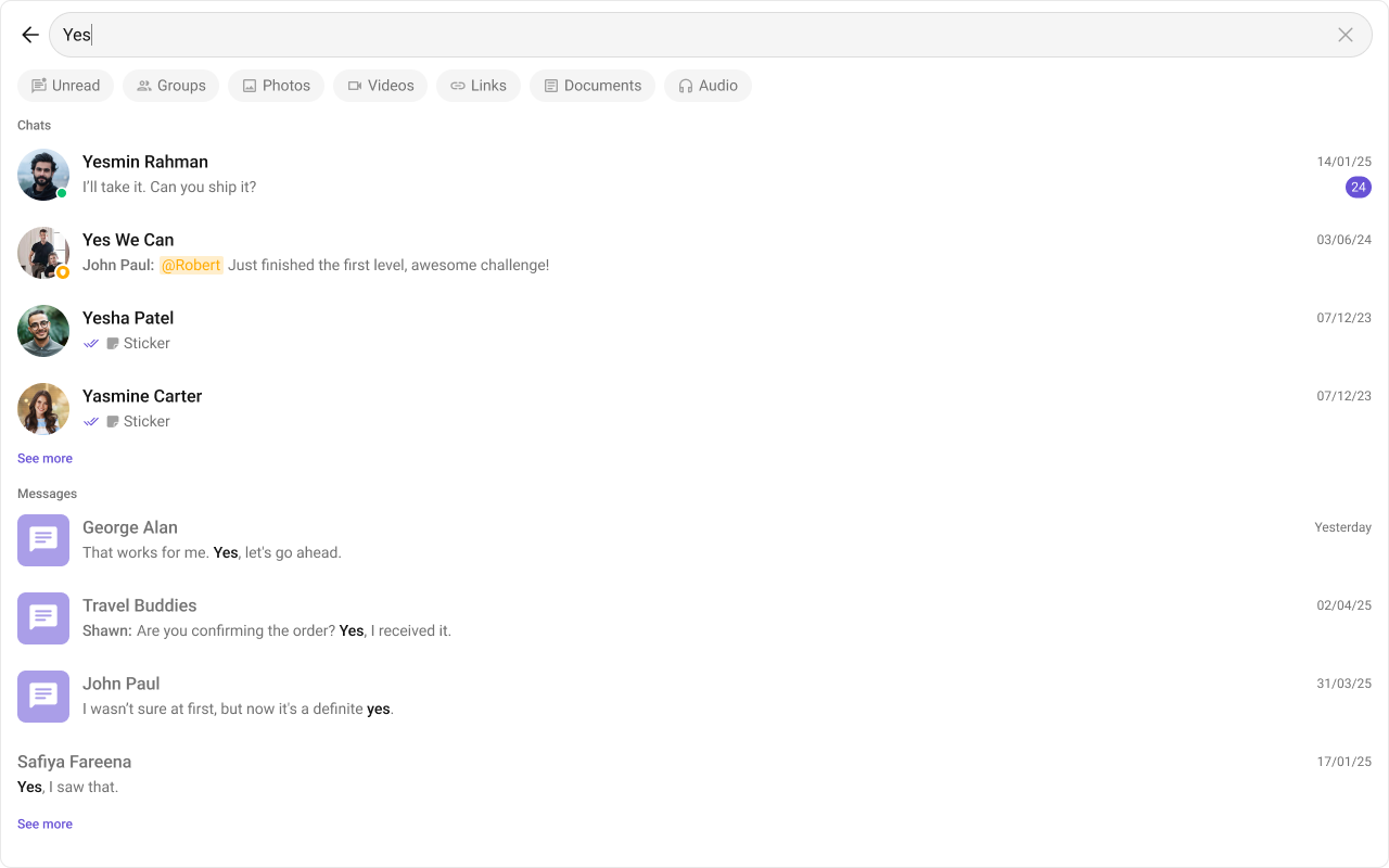 Search FiltersList of filters to be rendered in the Search component.searchFilters={[CometChatSearchFilter.Messages, CometChatSearchFilter.Photos, CometChatSearchFilter.Audio, CometChatSearchFilter.Documents]}